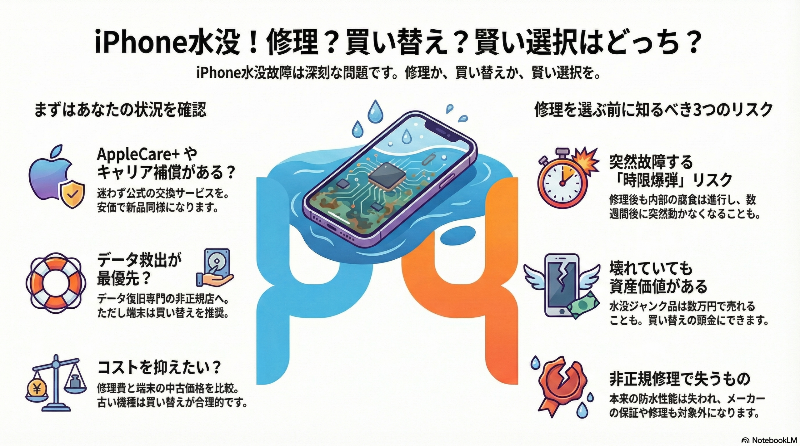 iPhoneの水没対応とは、「高額な修理か、賢い買い替えか」の選択です。最適な選択をするためには以下の3つの要件を確認してください。
